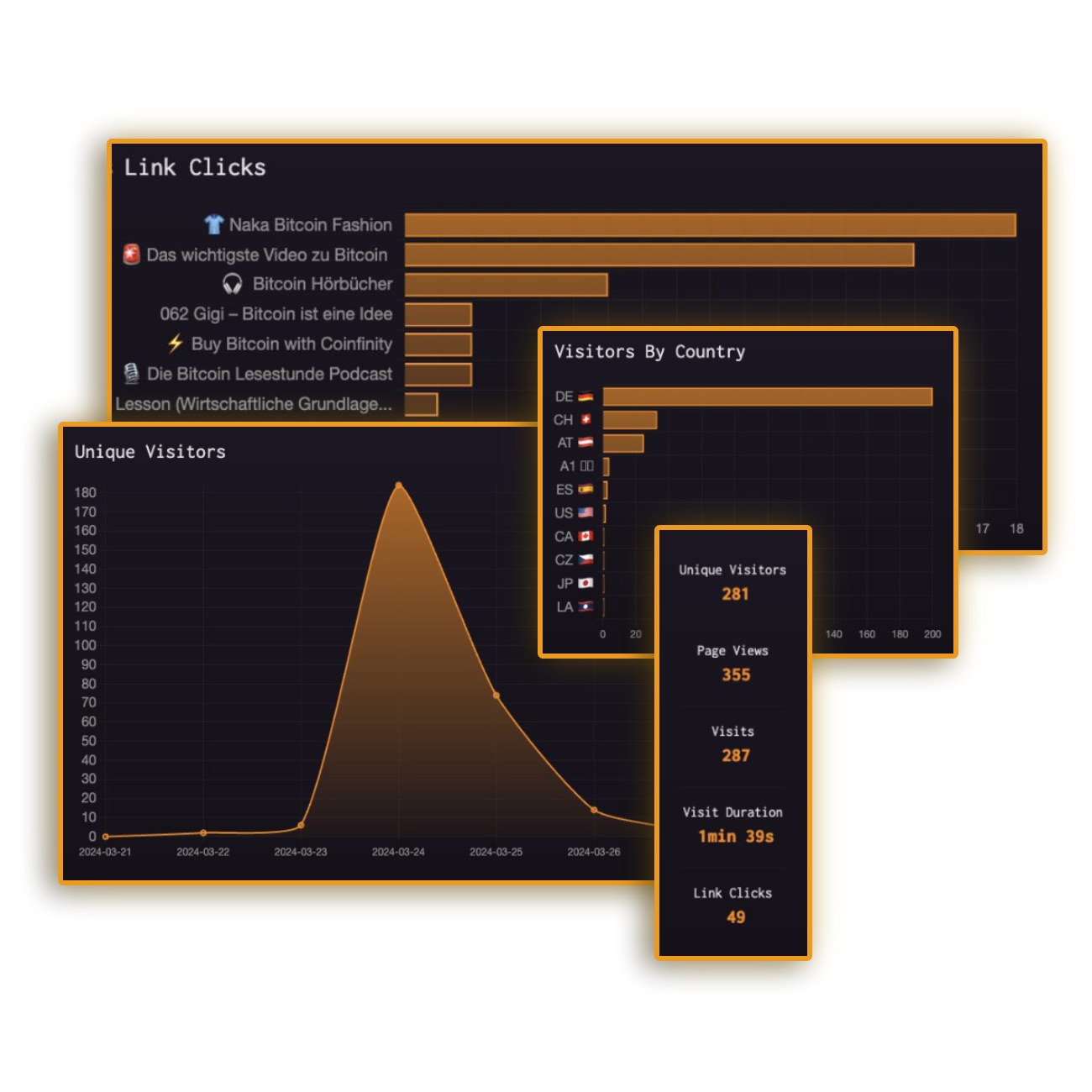 See how many people visit your profile, where they come from and which links they click on. Use this data to improve your profile and content. Privacy friendly - without tracking cookies!
